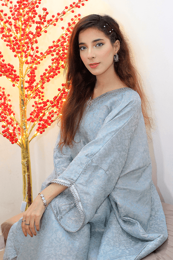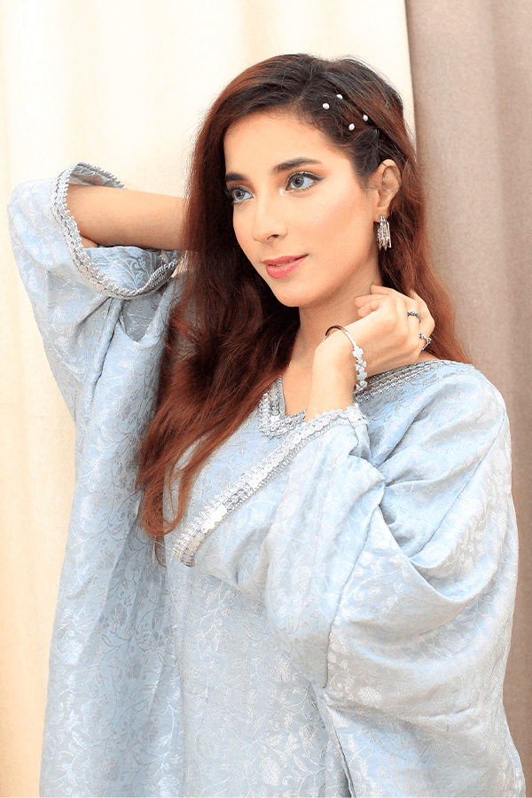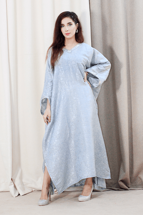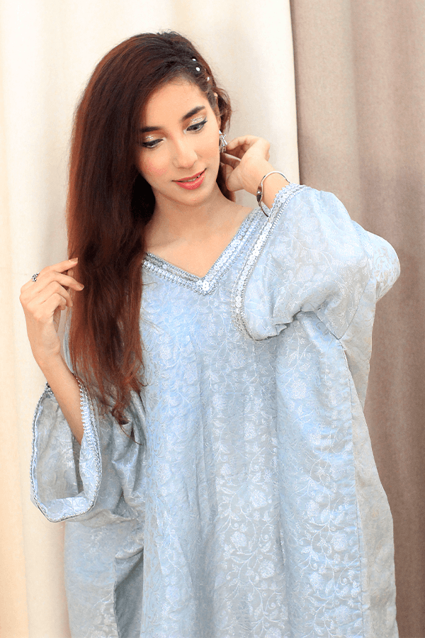 Upgrade your luxury wardrobe with our 1 piece kaftan dress.. Formed with banarsi , V shape neck line with fancy lace , baggy, loose cut kaftan with silver work long baggy sleeves with fancy lace to make it more effortlessly beautiful. perfect for weddings, party wear , occasions that gives you different yet Decent look. This is a must upgrade to your luxury collection!